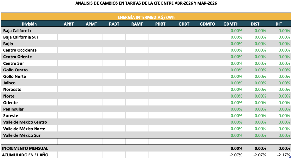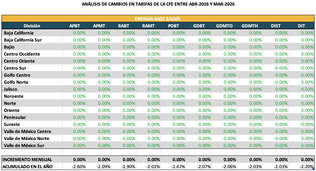 Análisis de tarifas reguladas CFE Suministro Básico de abril 2026 Públicado en 8 abril, 20268 abril, 2026 por admin A continuación te presentamos el análisis de las tarifas reguladas para CFE Suministro Básico aplicables en el mes de abril 2026. Puedes descargar el reporte detallado aquí.